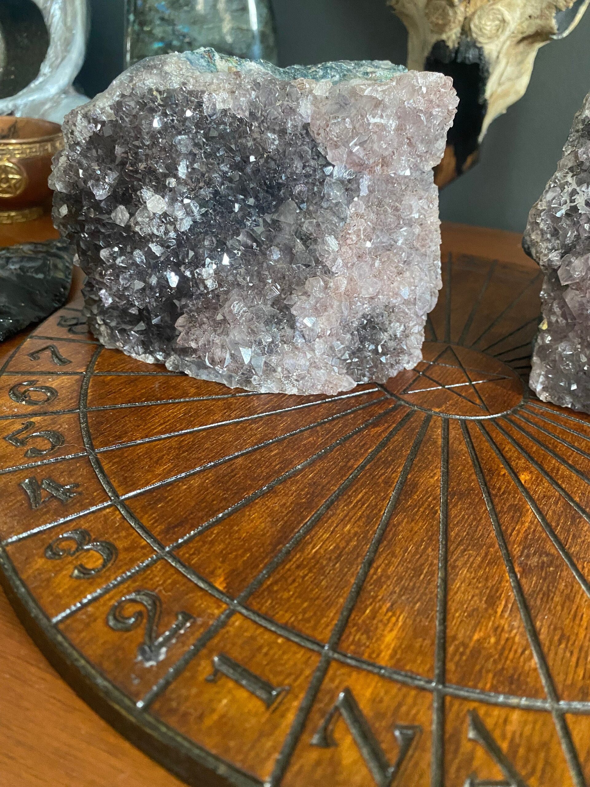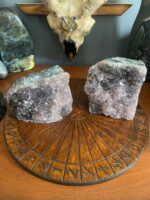These large Brazilian Amethyst bookends are a dramatic way to showcase your favorite books. They come as a set of 2 and both weigh about 3lbs each.