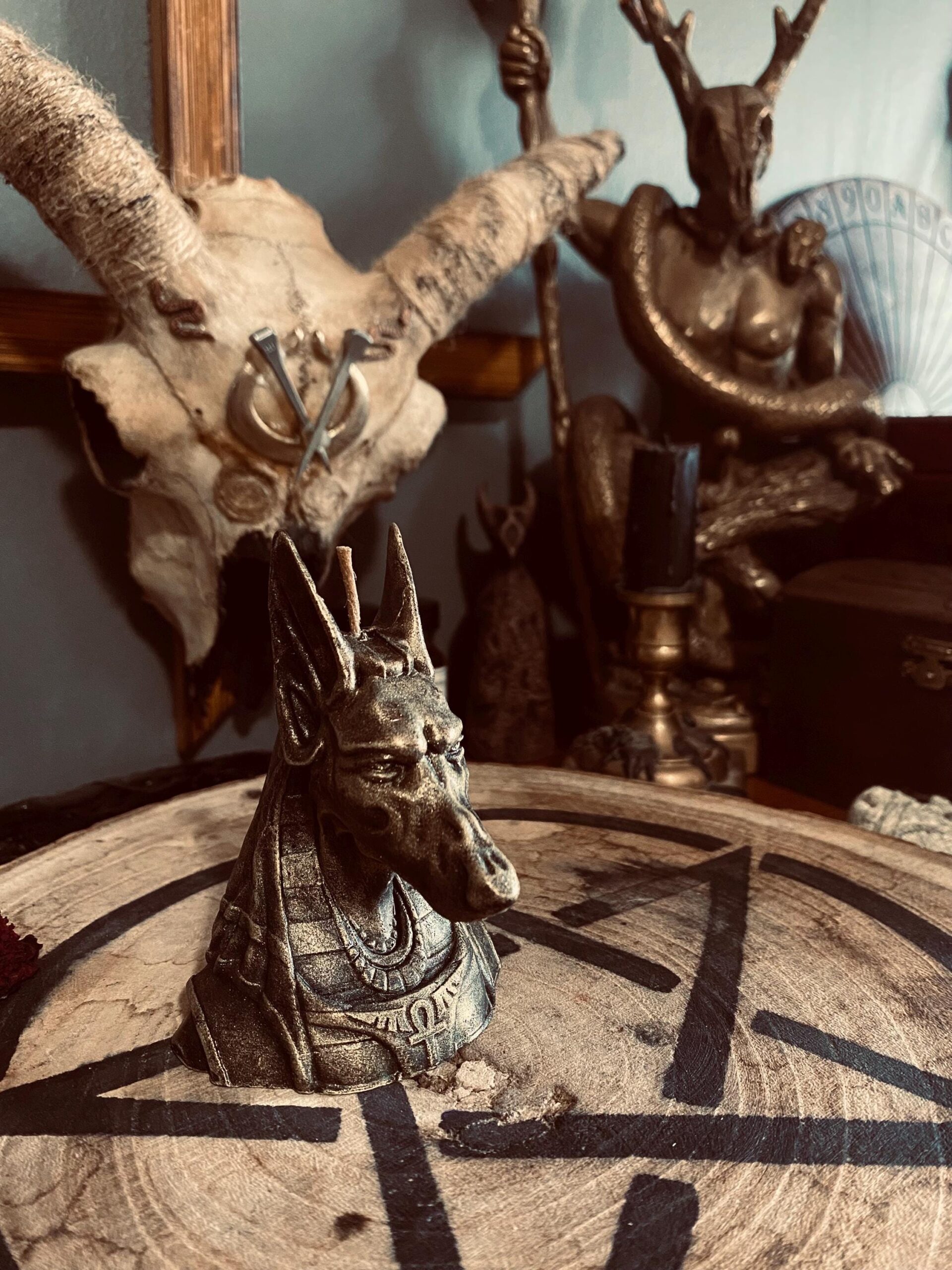 The Anubis candle is burned to honor or invoke the Egyptian god Anubis. Anubis is associated with the afterlife, death, and mummification. Burning this candle is essentially serving as a way to pay respect to the deceased or to connect with the spirit realm during rituals related to death and transition.