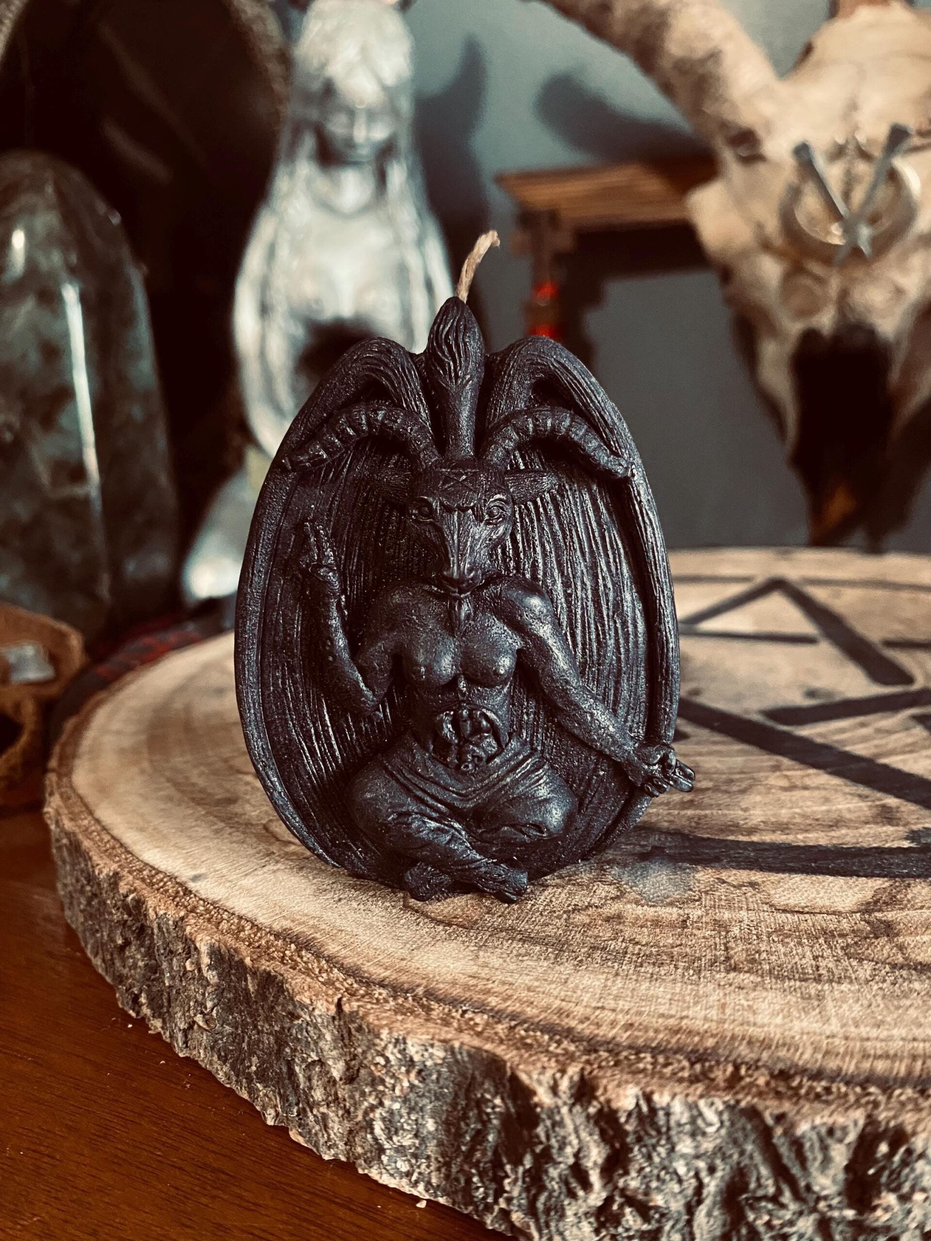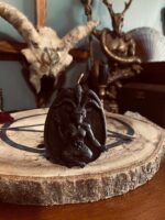 This is a black mini Baphomet that stands 4 inches tall. The Black Baphomet candle is typically used in spiritual work. It’s often used in rituals, focusing on personal power, protection, or invoking energies. The Black color represents the darker aspects of the divine and subconscious.