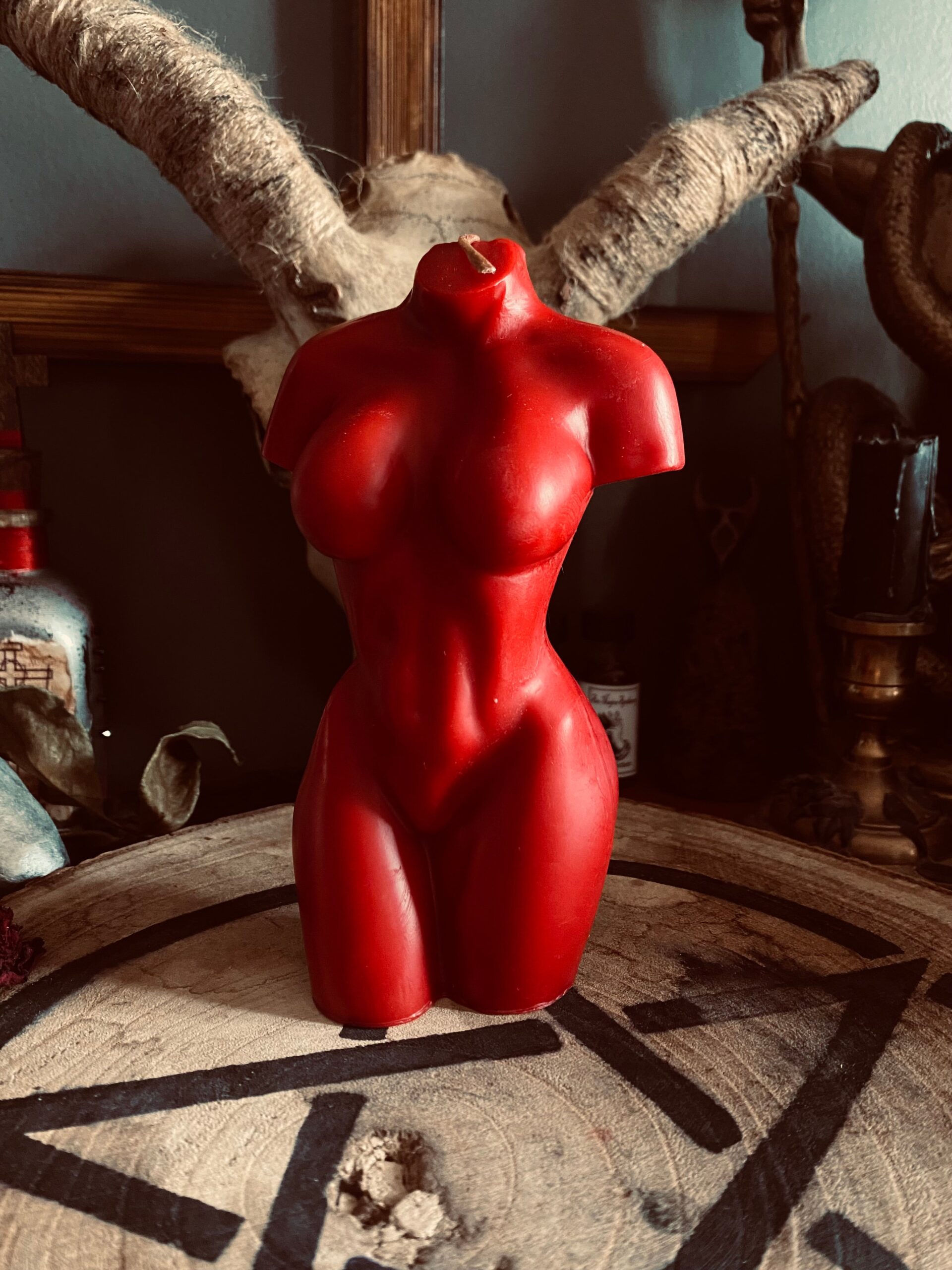 The female torso candle is typically burned in spiritual practices to represent and work with feminine energy. It is often associated with aspects like fertility, love, intuition, healing, and protection. The shape of the candle symbolizes the female form, and allows practitioners to tap into this power and energy of womanhood.