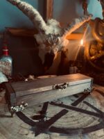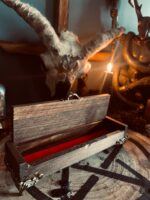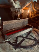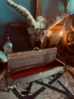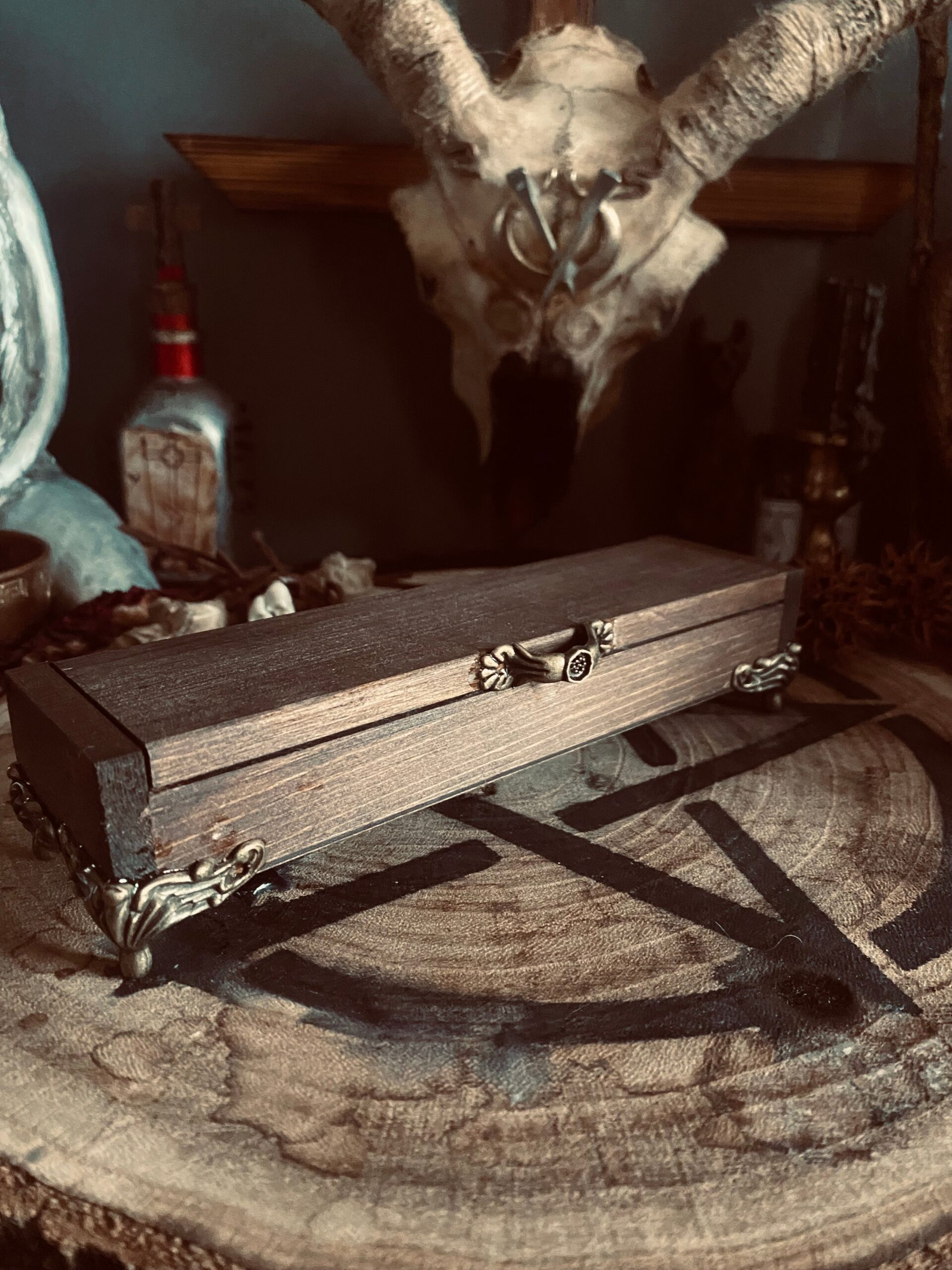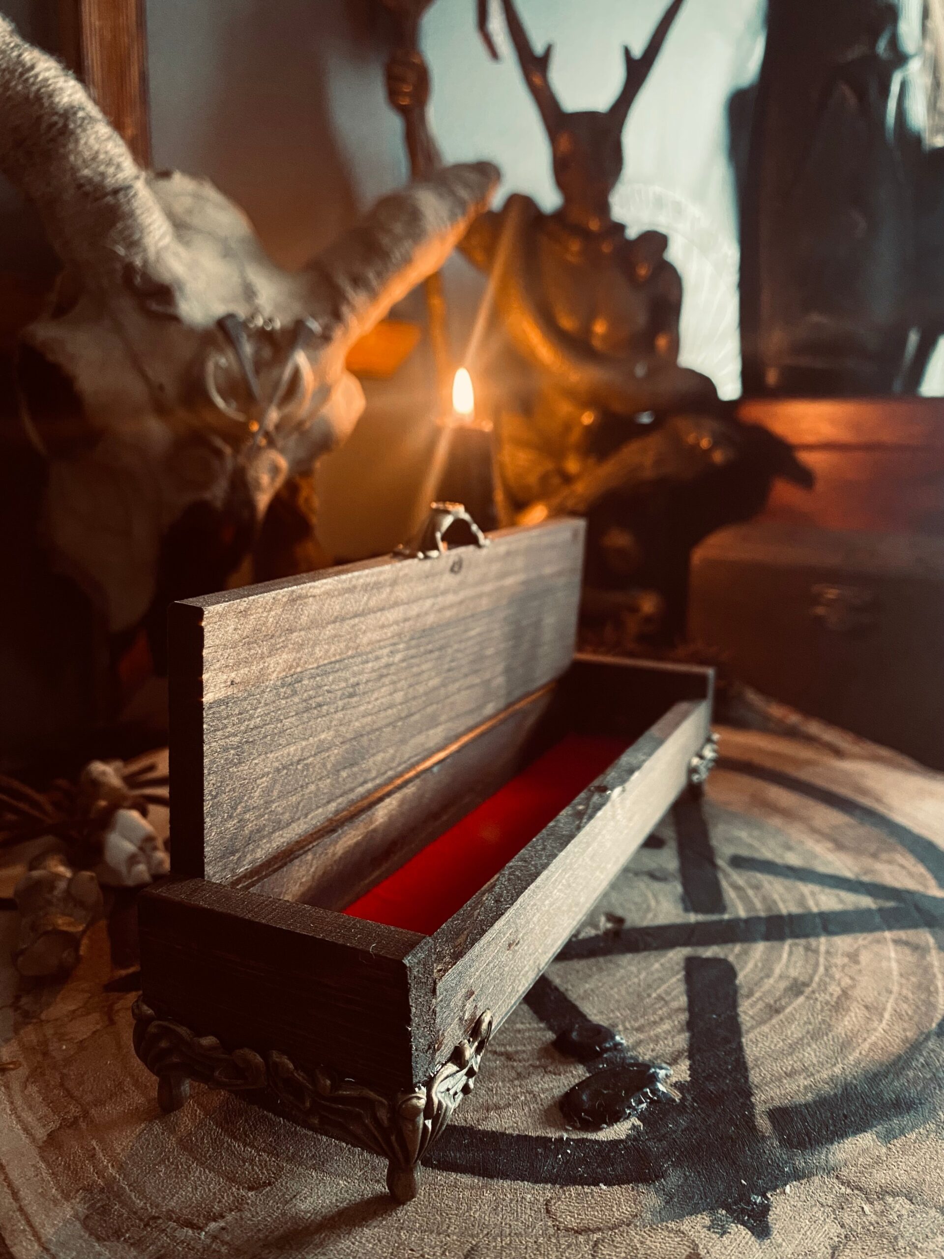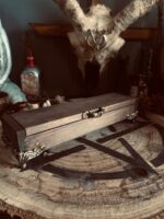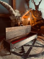 This box can be for anything you like such as amulets, talismans, working spirits, mojo bags, witch jewelry, crystals, etc. The box was stained and adorned with brass vintage like hardware with red velvet lining inside of the box. The hardware was glued on with special glue, not nailed in, due to the risk of splitting the wood. This beautiful vintage looking box is 7in L x 2in W x 1 1/2 in H and will be exceptionally beautiful on any Witch’s altar.