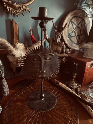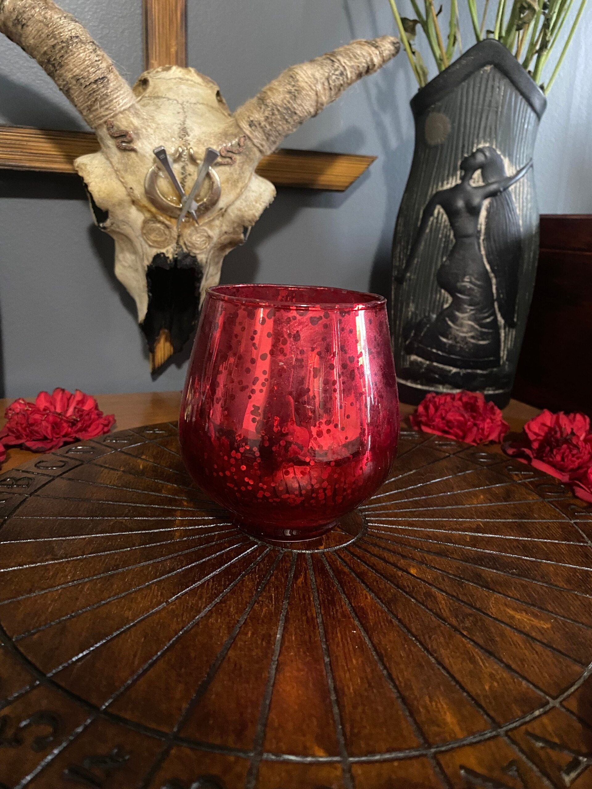 This is a red candle holder for votive candles or tealight candles. When candle is lit inside, the light has a red reflecting effect that’s perfect for the altar.