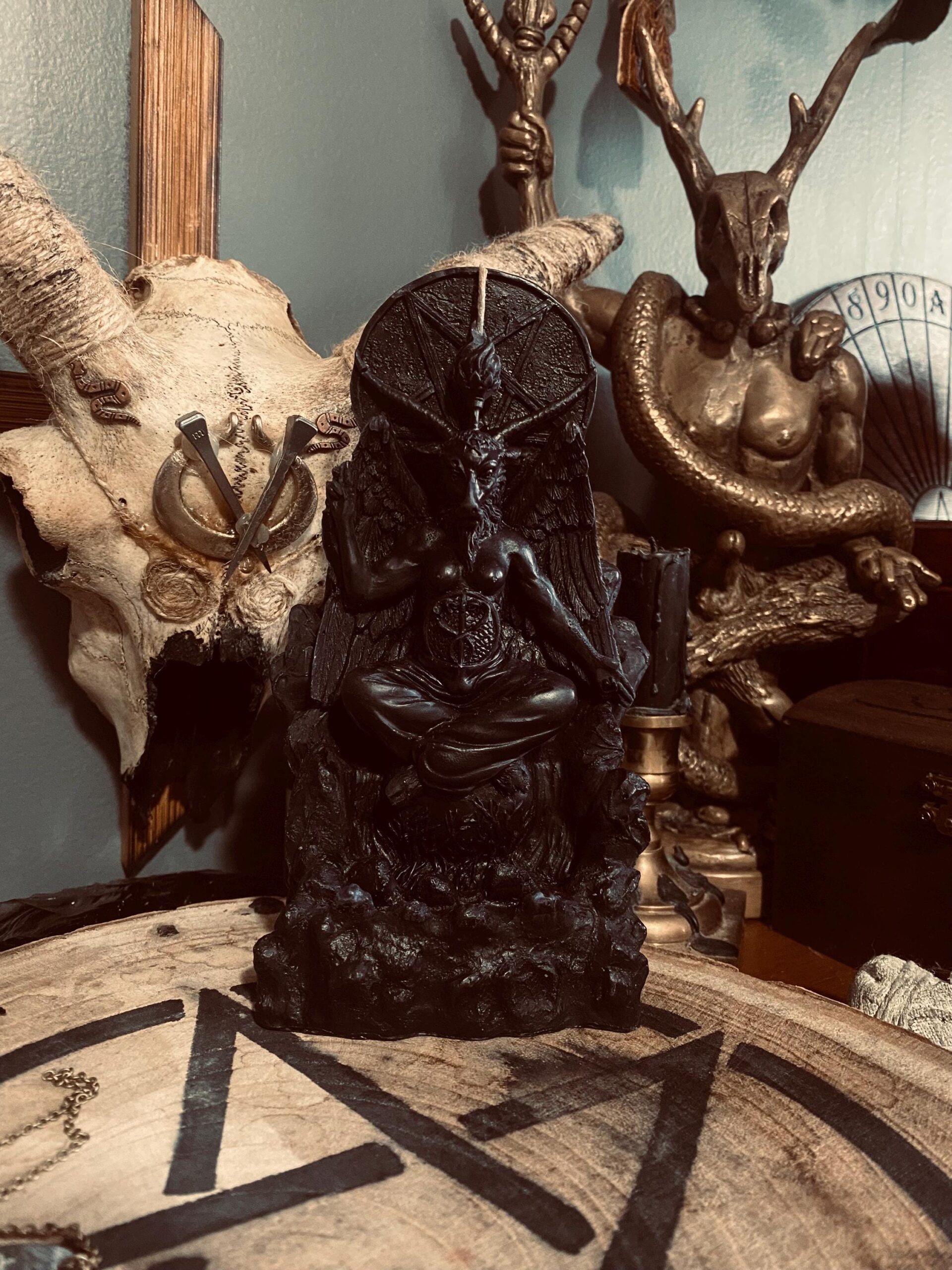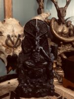 This is a Large Black Baphomet Candle, standing at 8 inches tall. The Black Baphomet candle is typically used in spiritual work. It’s often used in rituals, focusing on personal power, protection, or invoking energies. The Black color represents the darker aspects of the divine and subconscious.