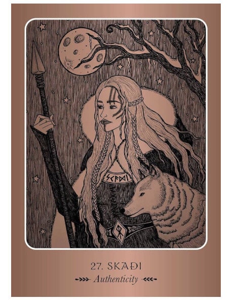 The images on the 44 cards depict strong feminine figures from mythology, folklore, and contemporary culture—all women who faced their own struggles and victories, and whose example will inspire others to discover their true self. The artwork was created in pen and pencil and reproduced in shades of black printed with bronze metallic ink to enhance their dark and mystical feel.