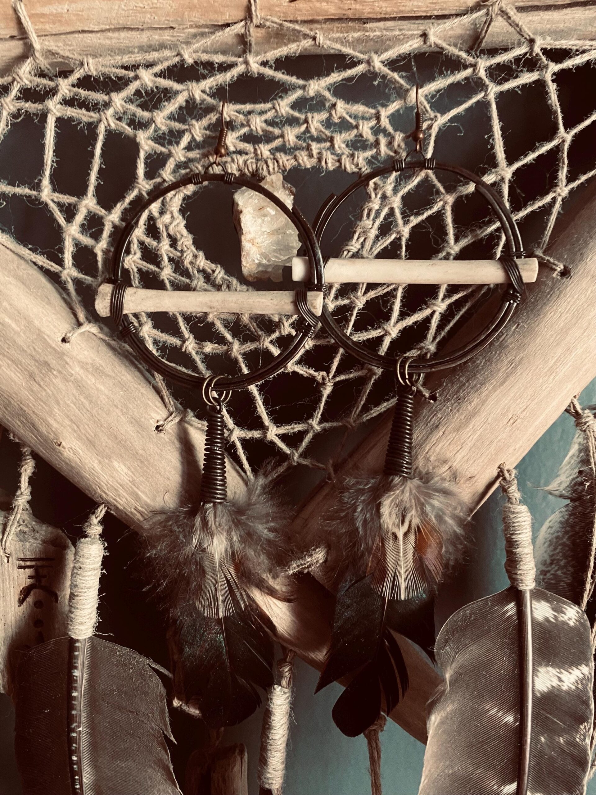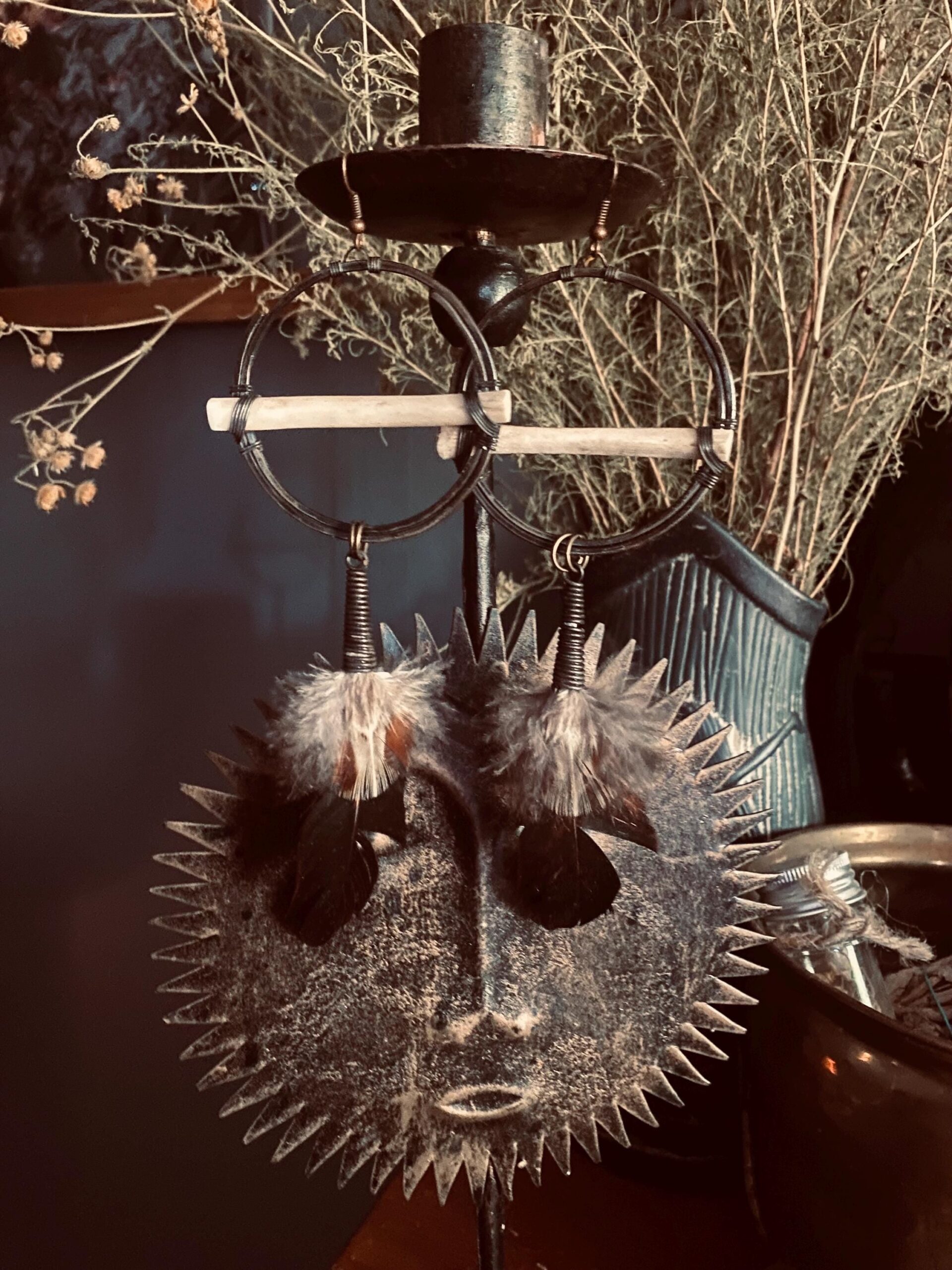 Earrings created with quartz, brass, vintage charms and salvaged bones.